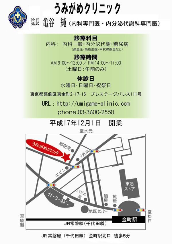 うみがめクリニックでは、風邪や腹痛などの一般内科の診療の他、糖尿病、高血圧、高脂血症(コレステロールや中性脂肪の増加)、肥満症などの生活習慣病、あるいは甲状腺、下垂体、副腎などのホルモンの病気(内分泌疾患)の専門的診療に取り組んでいます。